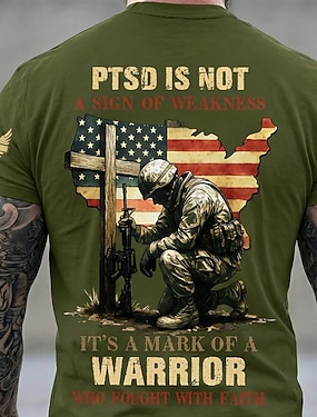Memorial Day "Till minne av våra fallna" herrtröja med heltäckande tryck för patriotiska soldater, rund halsringning, kortärmad, lila, hyllning till veteran, hedersgåva, designerkläder