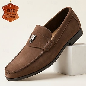 Herrloafers i brun mocka med metalldetaljer, bekväma mockasiner i premiumläder, snygga vardagsskor för kontor, arbete och eleganta vardagsutflykter