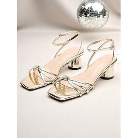 damklackar i metalliskt guld med ankelrem – glänsande cocktailpartysandaler med fyrkantig tå och låg klack
