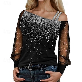 Dam Paljett Glittrig Fest Glitter Lappverk Nät Slät Mode Modern Ledigt Långärmad Rund hals Vanliga toppar Dagligen Helgen Blå Svart Vin Höst Vinter