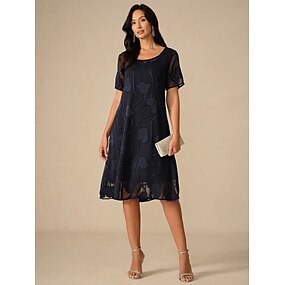 Dam Spetsklänning Festklänning Cocktail klänning Spets Lappverk Rund hals Kortärmad Midiklänning Bröllopsgäst Helgdag Mörkblå Sommar Vår