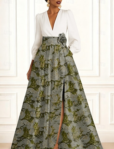 A-linje Golvlång Kvälls klänningar Elegant glittrande Silkig Långärmad Tröjkrage Trädgårdsfest Bröllop Ficka Jacquard med Blomtryck Rosett(er) Slits