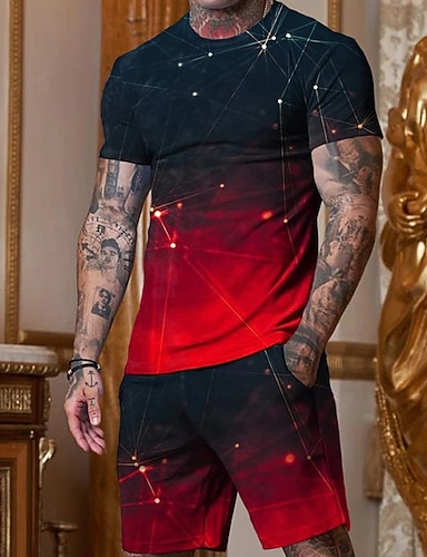 Herr Nyans 2st T-shirts uppsättningar Summer Tops Kortärmad Korta byxor Rund hals Sport Ledigt Utomhus Semester Sport 3D-utskrift Sommar Violett Rödhakeägg blå Rubinrött
