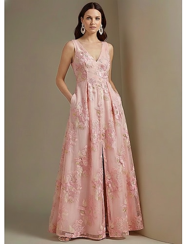 A-linje Golvlång Blommig klänning Kvälls klänningar Elegant Blommig Ärmlös V-hals Trädgårdsfest Bröllop Ficka Spets Organza Djupt ringad rygg med Blomtryck Plisserat Applikationsbroderi