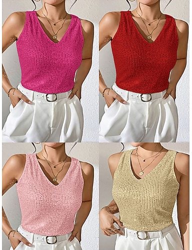 Dam T-shirt T-tröja Paljetter Ensfärgat Mode Sexig Klassisk Ärmlös V-hals Vanliga toppar Dagligen Utekväll Helgen Champagneguld Svart Vit Rodnande Rosa Rubinrött Sommar Vår