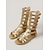 Damskor med guldfärgad platta gladiatorsandaler, knähöga sommarskor med remmar för semestermiddagar och resortkvällar &strandfester