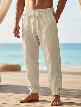 Herr Linne Byxor Långbyxor Sommarbyxor Strandbyxor Knappar Snörning Elastisk midja Slät Komfort Andningsfunktion Fullängd Ledigt Dagligen Helgdag Semester Mode Svart Vit
