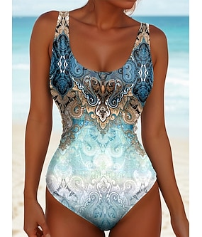 Kvinnors enstyckad baddräkt slimmande boho monokini rygglös semester strandkläder ombre geometrisk U-hals ärmlösa baddräkter