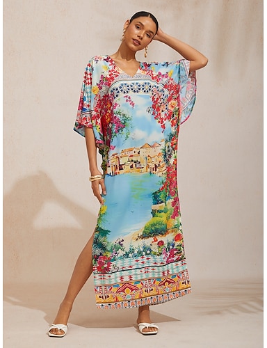Dam Maxiklänning Boho-klänning Solklänning Vardagsklänning Etnisk klänning Elegant bohemliv Semester Strand Helgdag Datum Normal Blommig Grafisk Ärmlös V-hals Blå Rodnande Rosa Orange Grön Sommar Vår
