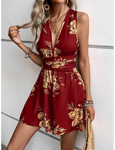 Dam Mini klänning A linjeklänning Grimma klänning Semester Ledigt Utomhus Utekväll Normal Blommig Ärmlös V-hals Svart Vin Marinblå Mörkgrön Sommar Vår