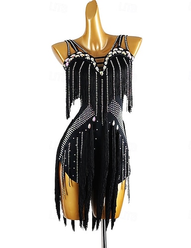 Latinamerikansk dansklänning med strass och tofs för kvinnor, ärmlös salsa rumba scenkläder