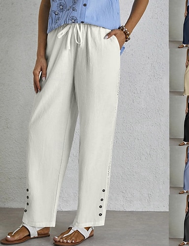 Dam Konstbomullslinne Casual byxor Sommarbyxor Rak Semester Grundläggande Ledigt Fullängd Hög midja Ensfärgat Slät Ficka Elastiskt midjeband Bekväm Mjuk Andningsfunktion Elastisk Dagligen Utomhus Gata