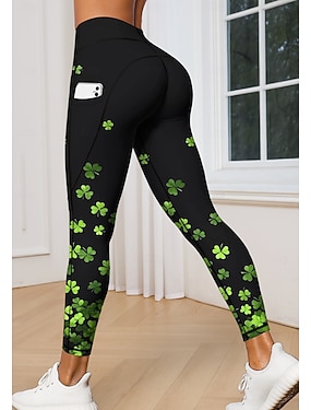 St Patrick Dam pilatesleggings Fitnessbyxor Damasker Fickor Stämpelskatt Sidfickor Pilates Gym Gymträning Trikåer Damasker Underdelar Blommig Trä / löv Klöver Grön och Svart Svart ljusgrön sporter