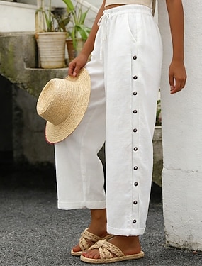 Dam Byxor av linne i bomull Kinesiska Sommarbyxor Streetwear Ledigt Fullängd Medium Midja Ensfärgat Snörning Ficka Bekväm Andningsfunktion Microelastisk Dagligen Utomhus Gata Blå Svart Vit Kaki