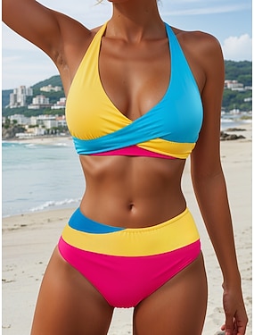 Kvinnors bikini 2-delad baddräkt Colorblock Tuff Backless Semester Strandkläder Halter Neck Ärm lös Baddräkter