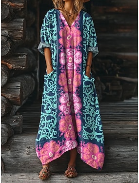 Dam Maxiklänning Boho-klänning Vintage klänning Vardagsklänning Vintage Dagligen Utomhus Semester Lös passning Geometrisk Långärmad V-hals Blå Purpur Fuchsia Grön Vår Höst