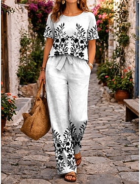 Dam Set med bomullslinne Kortärmad Rund hals Blommig Grafisk Elegant bohemliv Dagligen Ledigt Dagligen Semester Vit Sommar Normal