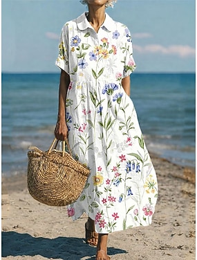 Mardi gras Dam Maxiklänning Bomulds Blanding Strandklänning Vardagsklänning Boho Chic klänningar bohemliv Semester Hawaiisk Helgdag Lös passning Blommig Kortärmad Tröjkrage Vit Sommar Vår