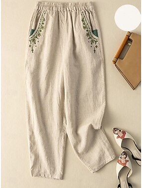 Dam Konstbomullslinne Långbyxor Sommarbyxor Strandbyxor Semester Mode Streetwear Fullängd Hög midja Blommig Broderad Ficka Brett skaft Mjuk Andningsfunktion Microelastisk Strand Helgdag Aprikos Vit