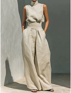 Dam Set med bomullslinne Byxuppsättningar Ärmlös Rund hals Ensfärgat Elegant Mode Streetwear Ledigt Dagligen Utomhus Blå Svart Vit Sommar Lös passning
