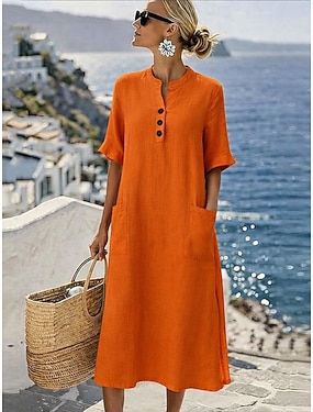 Dam Maxiklänning Konstbomullslinne Skiftklänning Vardagsklänning Grundläggande Modern Dagligen Helgen Lös passning Slät Halvlång ärm V-hals Marinblå Orange Grön Khaki grön Sommar Vår
