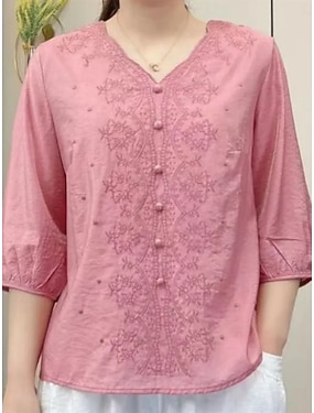 Kvinnors linne-liknande konstgjort bomullslinne blus spets broderade knappar enfärgad daglig stilren avslappnad 3/4-lång ärm V-hals vanliga toppar daglig blå vit gul rosa marinblå sommar vår höst