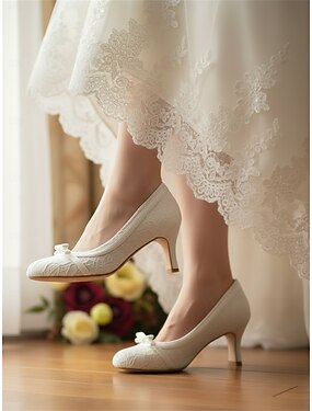 Elfenbensvita pumps i spets med kitten heel och rosett – brudskor med flapper-motiv från 1920-talet för brudar, formella evenemang och trädgårdsceremonier