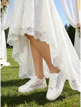 Vita platåskor med spets för bröllop – romantiska brudskor för utomhusbröllop i trädgården