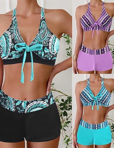 Dam Vanligt Badkläder Tankini 2 st Shorts Baddräkt Halterneck 2 st Tryck Standkläder Sommar Leopard Ärmlös Baddräkter