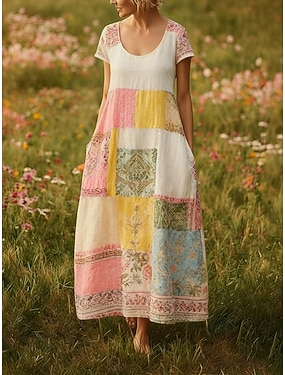 Dam Maxiklänning Boho-klänning Vardagsklänning Vintage Dagligen Utomhus Strand Lös passning Blommig Kortärmad U-hals Gul Sommar Vår