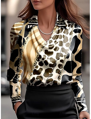 Dam Skjorta Rynkad Draperad Grafisk Leopard Geometrisk Elegant Stylish Ledigt Långärmad Skorstenskrage V-hals Vanliga toppar Dagligen Arbete Festkvällskläder Svart Ljusbrun Brun Höst Vinter
