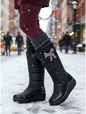 Vattentäta vinterstövlar för kvinnor - röda quiltade snöstövlar med rosett och strassdetaljer, halkfri sula, perfekta för snöväder, utomhusaktiviteter och vardagliga vinterkläder