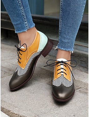 brogue oxford-skor för kvinnor i flera färger med chevronmönster och kontrasterande paneler i konstläder – vintageinspirerade skor med snörning