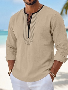 Herr Skjorta Linneskjorta Sommarskjorta Strandskjorta Ensfärgat Ledigt Semester Svart Vit Grön Kaki Långärmad Rund hals Sommar Kläder Broderad