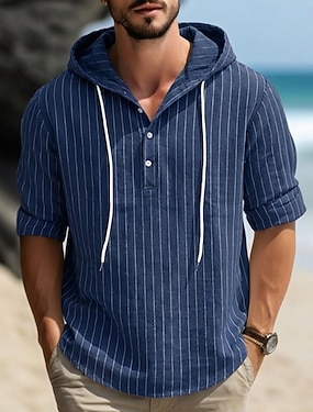 Herr Skjorta Linneskjorta Sommarskjorta Standkläder Huvtröja Randiga skjortor Vertikala remsor Ledigt Semester Svart Vit Marinblå Grön Långärmad Luvtröja Sommar Vår Kläder