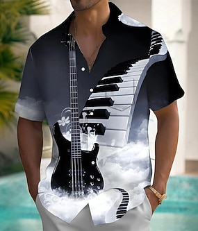 Herr Styrelseledamöter Guitarr Musikinstrument Skjorta Sommarskjorta Knapp upp skjorta Kortärmad Vintage retro Utomhus Semester Vardag Sommar Vår Nedvikt 3D-utskrift krage skjortor Främre en ficka