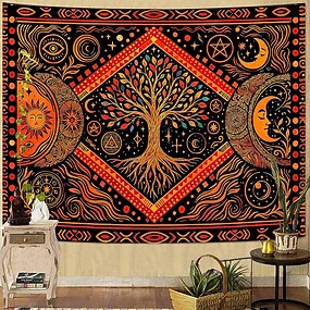 Livets träd sol och måne himmelsk väggbonad mystisk ockult symboler orange svart boho väggbonad heminredning sovrum vardagsrum yoga bakgrund