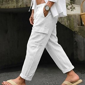 Herr Militärbyxor Linne Byxor Långbyxor Sommarbyxor Snörning Elastisk midja Rakt ben Ensfärgat Slät Komfort Andningsfunktion Fullängd Ledigt Dagligen Helgdag Semester Mode Svart Vit Oelastisk