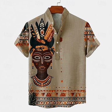 Herr Etik / afrikansk Urfolk Skjorta Button Down skjorta Kortärmad Vintage retro Helgdag Ledigt / vardag Sommar Vår Kinakrage Henley krage 3D-utskrift Linne som skjorta 다크 카키 Svart Grön Kaki