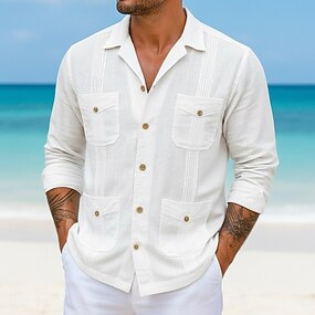 Herr Skjorta Linneskjorta Guayabera skjorta Sommarskjorta Strandskjorta Ensfärgat Ledigt Strand Vit Långärmad Lägerkrage Sommar Vår Kläder Flera fickor