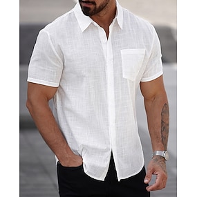 Herr Skjorta Linneskjorta Casual skjorta Knapp upp skjorta Bomullskjorta Slät Semester Gata Vit Kortärmad Nedvikt Sommar Kläder Ficka