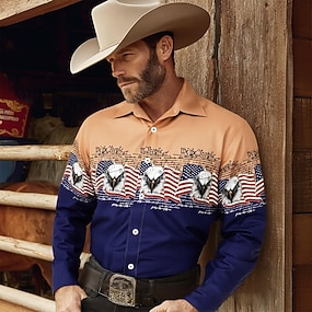 Herr Djur Varg Amerikanska amerikanska flaggan Skjorta Västerländsk skjorta Knapp upp skjorta Långärmad Vintage retro Helgdag Ledigt / vardag Vår Höst Nedvikt 3D-utskrift krage skjortor Svart 1 Svart
