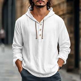 Herr Skjorta Linneskjorta Standkläder Knapp upp skjorta Huvtröja Slät Semester Ledigt Vit Blå Armégrön Grå Långärmad Huva Sommar Vår Kläder Knappar