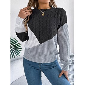 Dam Tröja Pullover tröja Ledigt Mjukt Färgblock Ribbad Rund hals Lappverk Stickat Långärmad Vanliga toppar Sticka Utomhus Dagligen Helgen Svart Rodnande Rosa Höst Vinter