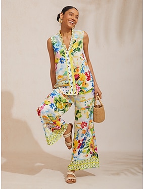 Luftig ärmlös topp i linne-look med citrusträdgård och semestermönster