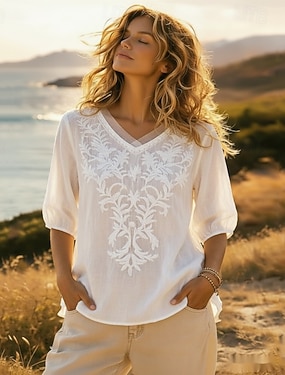 Dam Blus Konstbomullslinne Broderad Mönster Asymmetrisk nederkant Blommig Elegant Stylish 3/4 ärm V-hals Vanliga toppar Dagligen Helgdag Utekväll Vit Gul Rubinrött Marinblå Purpur Sommar Vår