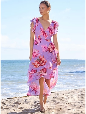 Dam Solklänning Blommig klänning Sommarklänning Knälång klänning Purpur Ärmlös Blommig Botanisk Mode Blommor Volang Blomstil Tryck Vår & sommar Kryss Veckad Mönster klänning Strandsemester Semester