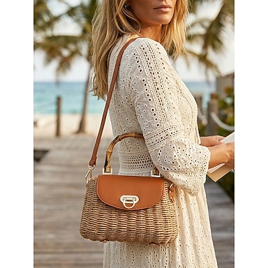 Damväska i vintage-modell med halm och bambuhandtag, axelväska i läder med justerbar rem, för sommarsemester och vardagsbruk, finns i flera färger