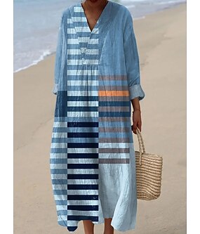 Dam Maxiklänning Skiftklänning Solklänning Semester Ledigt Strand Utekväll Lös passning Grafisk Geometrisk Abstrakt Långärmad V-hals Blå Ljusgrön Rubinrött Sommar Vår