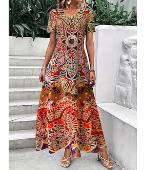 Kvinnors maxiklänning linne lik andningsbar lätt sundress A-linje klänning semester avslappnad boho strand gå ut blommönster grafisk geometrisk lång ärm V-hals blå röd himmelblå orange sommar vår